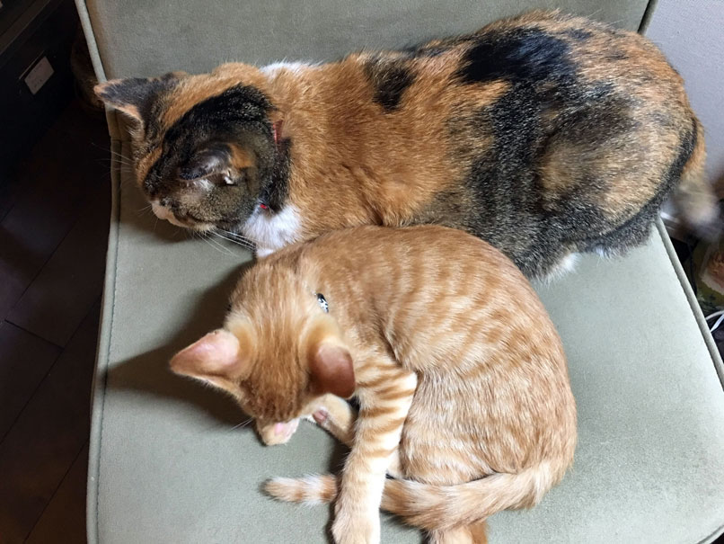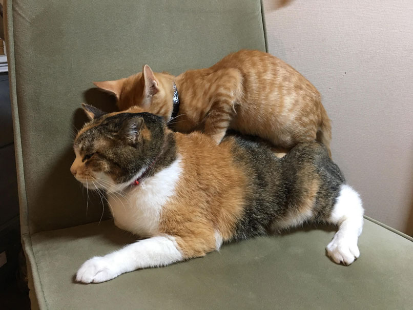 この行為は、成猫に近づいてきたため後尾の練習の意味があると考えられます。