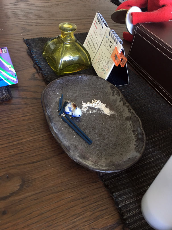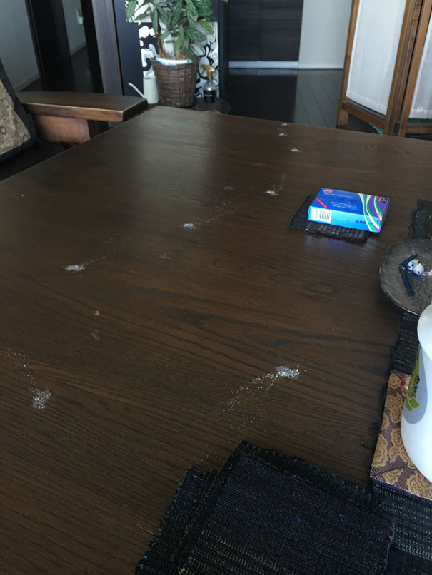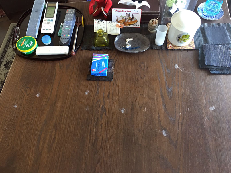 テーブルに点々とお線香の燃えておちた灰?の跡が。。。
