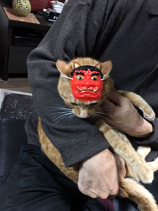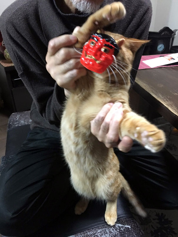っと、無事、鬼のお面もつけられるようになって、豆まきでっす!